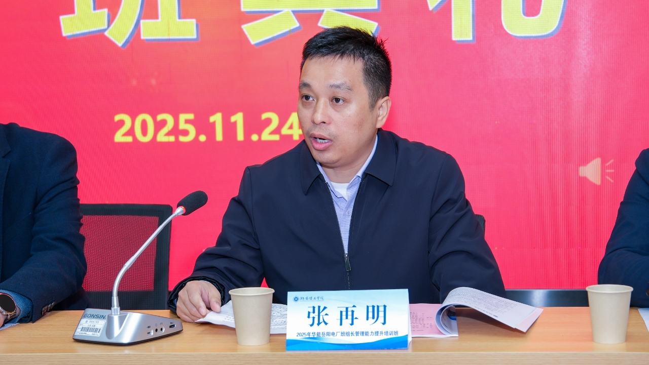 张再明代表华能岳阳电厂讲话。他对我校为本次培训所做的周密安排表示感谢,同时也对参训学员提出三点期望:一是认清培训意义。希望通过本次培训,学员能够成为懂管理、善创新能攻坚的复合型基层管理者,为电厂高质量发展筑牢根基;二要聚焦能力提升。做到学以致用,将培训成果转化为管理应用实践,带动团队共同进步;三要严守培训纪律。积极参与课堂,展现电厂员工特别能吃苦、特别能战斗的优良作风,维护企业形象。